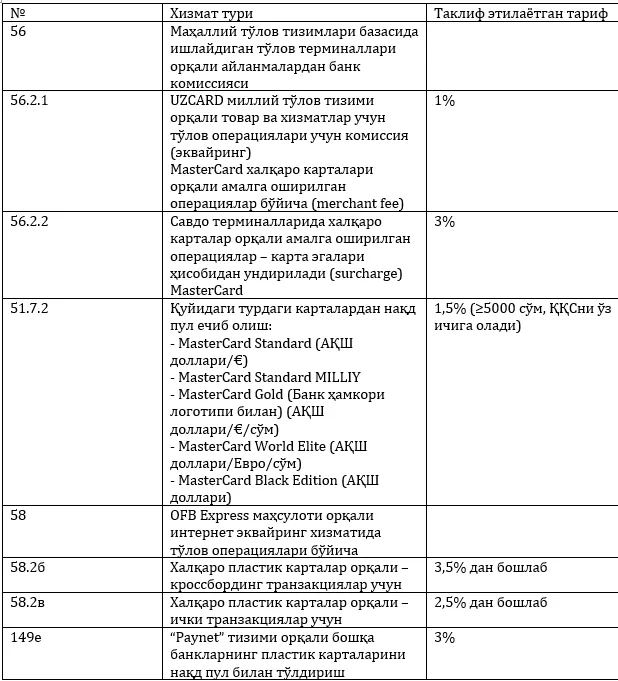 MasterCard kartalari bo‘yicha operatsiyalar uchun tariflarga o‘zgartirishlar kiritildi. 56.2.1, 56.2.2, 51.7.2, 58.2, 58.2б, 149e bandlariga o‘zgartirishlar kiritildi, shuningdek yangi 58.2в bandi qo‘shildi. Batafsil ma’lumot — Protokolning 1-sonli Ilovasida.