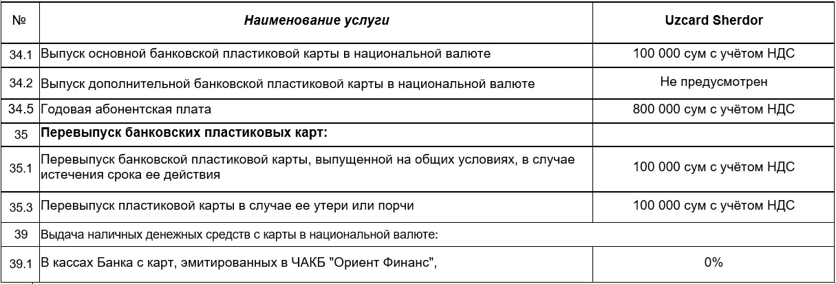 Комиссии Банка за выпуск и обслуживание карт «Uzcard Sherdor» со сроком действия 3 года.